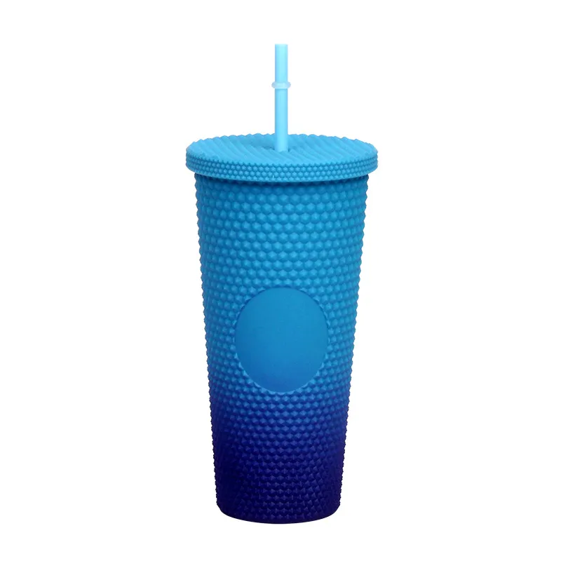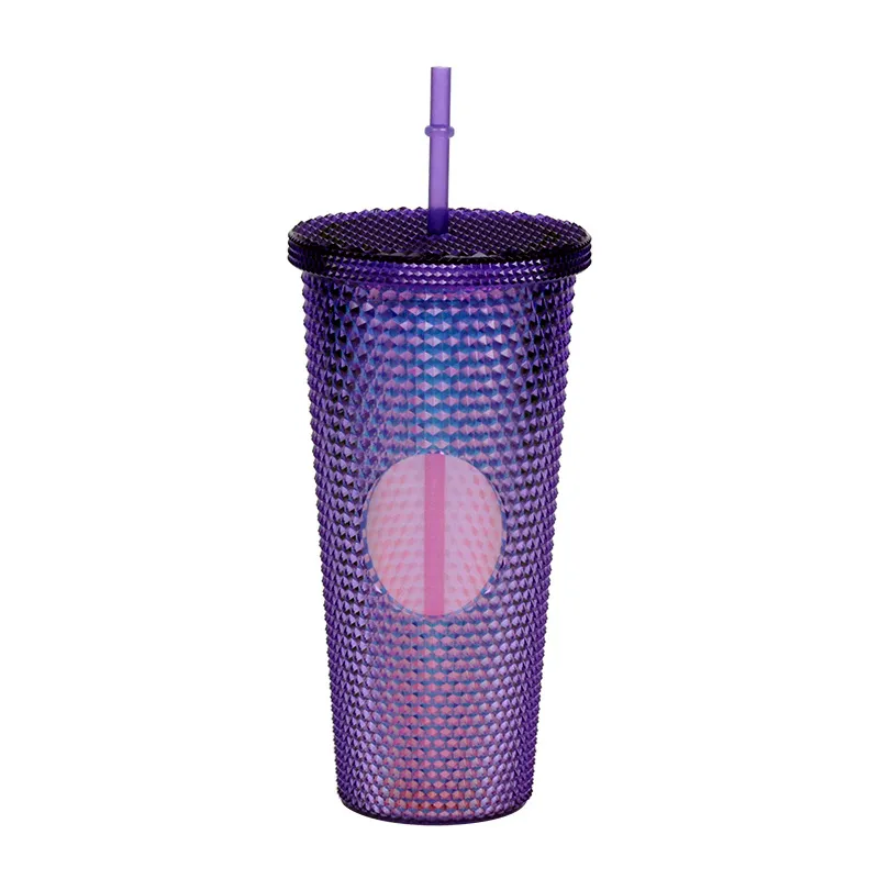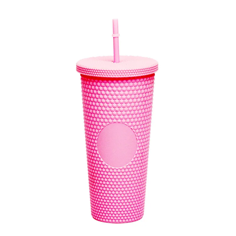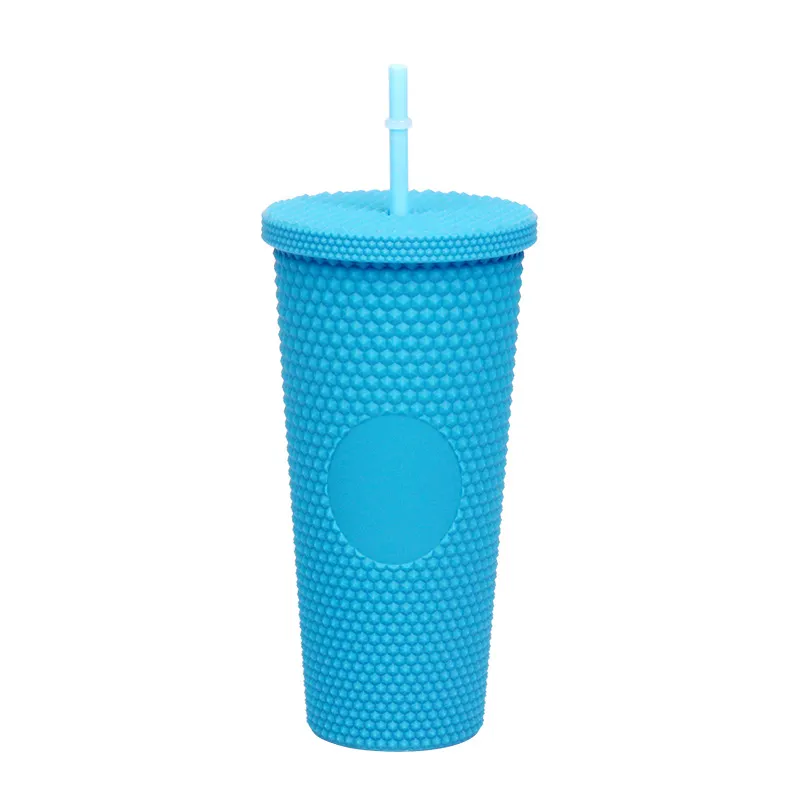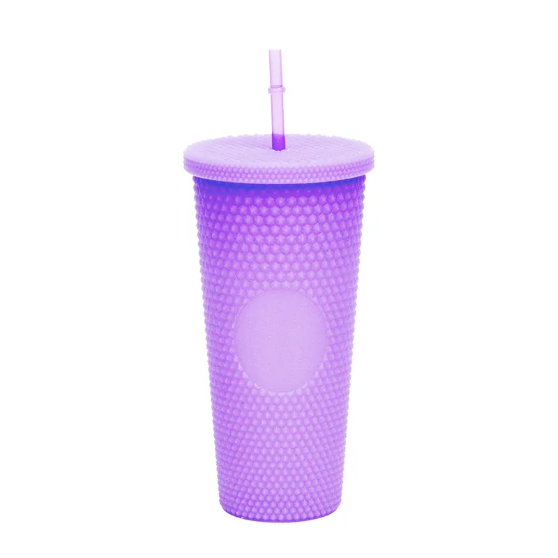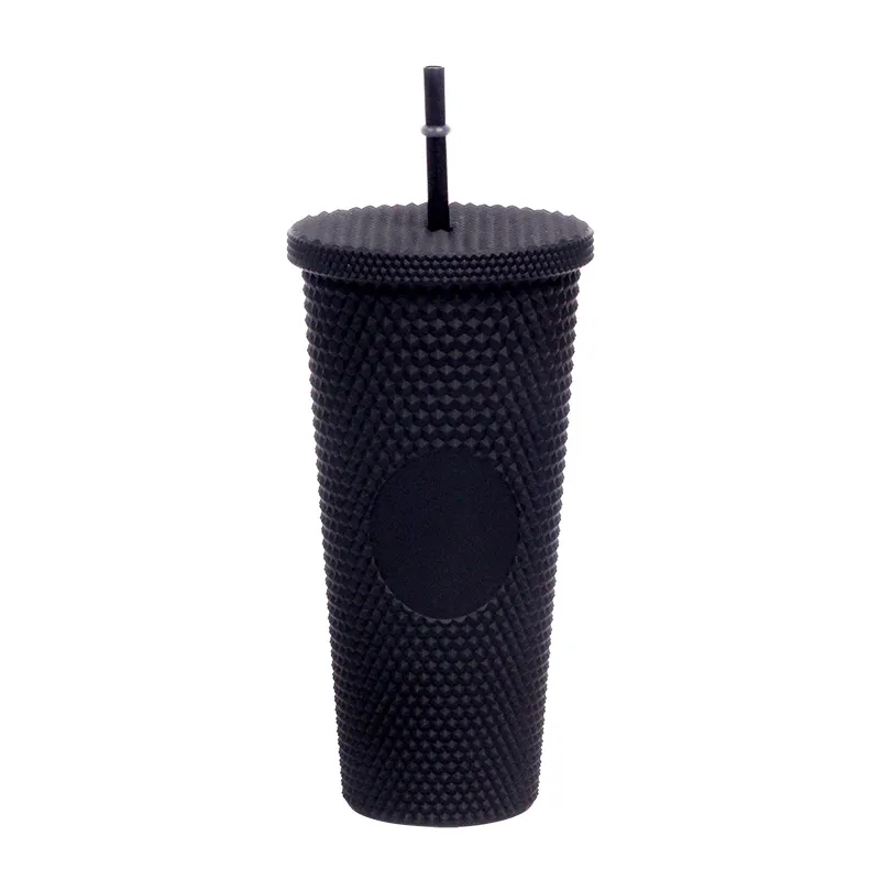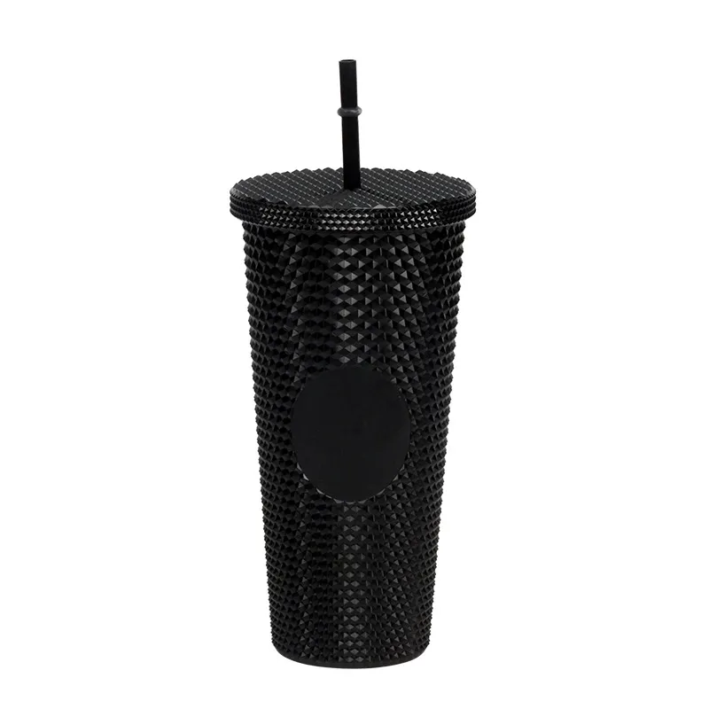 This creative "Durian Cup" (often referred to as a Studded or Diamond Tumbler) is a factory-direct favorite for global retailers. Inspired by trending coffee chain aesthetics, its exterior is covered in a raised, studded grid pattern that reflects light beautifully and provides a stimulating tactile grip (playfully nicknamed the "spiky" or "prickly" cup). Featuring high-quality double-wall insulation, it keeps cold drinks frosty for hours without condensation (sweating) on the outside. With its large capacity and matching reusable straw, it is the ultimate fashion accessory for hydration and social media photos.